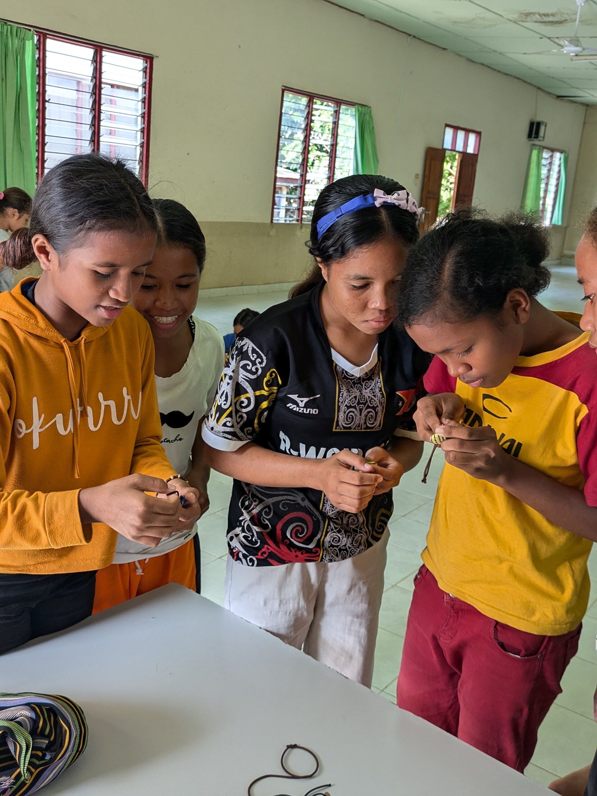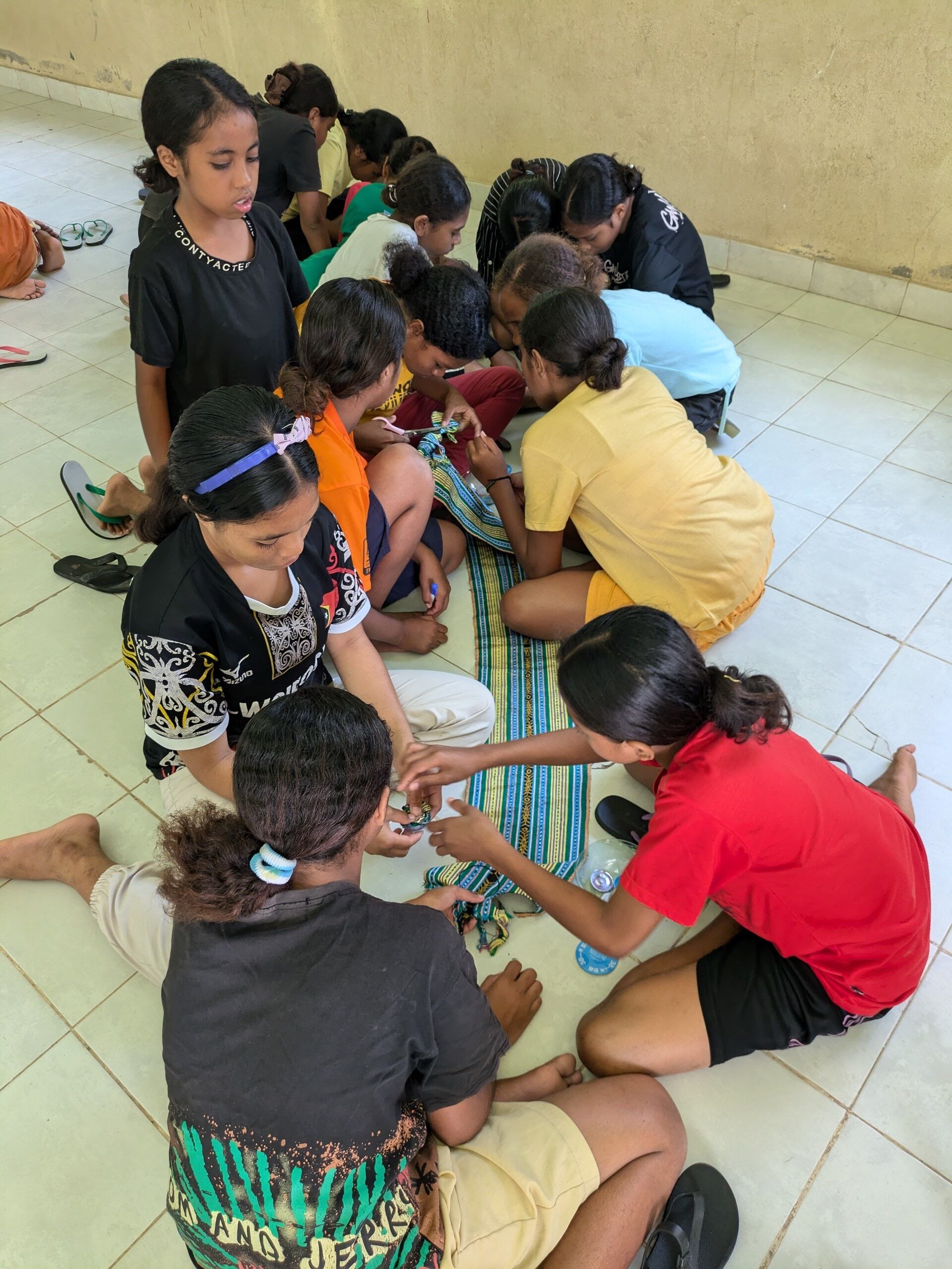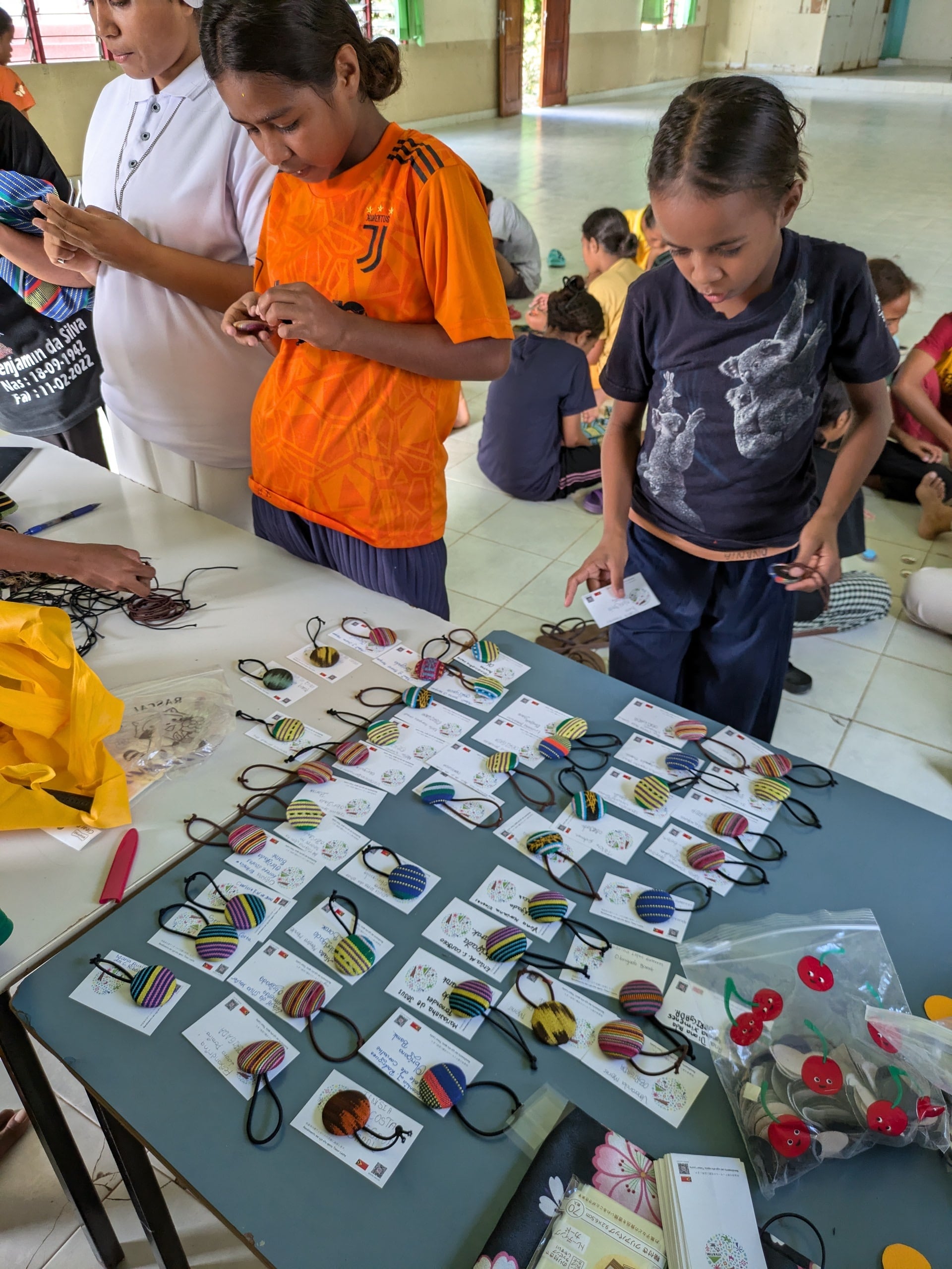 東ティモール・ラガ・ロスパロスの孤児院で子供たちが作ったクルミボタンのゴムとブローチです。